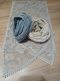 - Due in morbido tessuto stropicciato e marmorizzato, una color panna l’altra avio/grigioazzurro. Lunghezza 160 cm circa. Larghezza quando stirate: 20 cm circa, stropicciate 6 cm circa