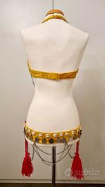 Set danza Tribal Fusion / ATS o danza del ventre, composto da reggiseno, cintura, cerchietto e bracciale, realizzati in velluto elasticizzato oro e decorati a mano con monete, conchiglie, nappe in lana rossa, fili intrecciati e fiori bianchi. Tutto il set è interamente realizzato e cucito a mano su mie misure. Buone condizioni con qualche normale segno di usura. Indossato solo 1 volta. Reggiseno — taglia 3B — Struttura con ferretto. - Bretella halter al collo. - Chiusura posteriore con 2 gancetti. - Regolato su misura e successivamente foderato a mano in velluto. Internamente non foderato. Misure reggiseno: •Lunghezza fasce laterali: 24 cm e 22 cm •Altezza chiusura posteriore: 3 cm •Lunghezza bretellina al collo (da fine coppa): 47 cm Cintura - Chiusura regolabile con cordone beige che passa attraverso piccoli ganci. Misure cintura: •Lunghezza fascia: 81 cm •Altezza: 5 cm •Lunghezza totale nappe: 37 cm •Altezza nappe (da cintura): 18 cm Bracciale - Base elastica rivestita in velluto. Misure bracciale: 24 cm x 6 cm Cerchietto - Rivestito in velluto e decorato con conchiglie, due grandi fiori bianchi e trecce/fili di lana rossa.