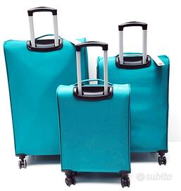 Il set è composto da tre trolley che possono essere richiusi uno nell'altro e dispongono di doppio manico imbottito a scomparsa per una comoda presa sia laterale che da lato superiore. Trolley misura Grande Litri 104 KG 3,00 con dimensioni Cm. 77x47x29.