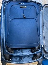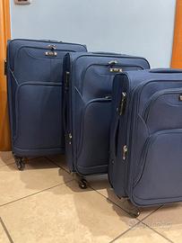 Come nuove usate poche volte set valigie semirigide impilabili tra loro in tessuto super leggeri 4 ruote piroettanti. Chiusura e apertura con cerniera bidirezionali a doppi cursori, lucchetto combinazione a 3 numeri per il vano principale. Con lacci ferma indumenti e tasca retina con chiusura zip, all'esterno push button per estrazione maniglia telescopica da 30cm a 50cm per il traino, 2 tasche frontali con zip a doppi cursori, copri angoli superiori. **Misura da 56cm** Peso 3.40 kg - Capacità di carico 42 Litri - Dimensioni esterne 56x39x25cm, dimensioni interne 49x36x22 cm, è perfetto per EasyJet. **Misura da 65cm** Peso 3.95 kg - Capacità di carico 64 Litri - Dimensioni esterne 65x42x28cm, dimensioni interne 58x40x28 cm. - **Misura da 75cm** Peso 5.00 kg - Capacità di carico 95 Litri - Dimensioni esterne 75x48x31cm, dimensioni interne 68x45x31 cm.