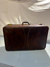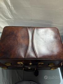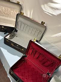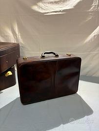 Elegante set di tre valigie rigide vintage in pelle (o similpelle) color marrone scuro, con dettagli e chiusure in metallo dorato. Design classico e intramontabile, perfetto come oggetto decorativo, per collezionisti o per un utilizzo originale nei viaggi.