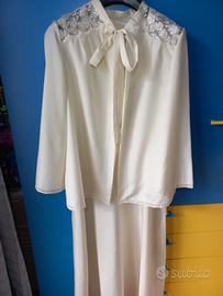Set vestaglia+camicia da notte di seta color champagne, composto da una camicia da notte con inserti in pizzo e apertura laterale per agevolare l'indossamento, ed una vestaglia corta con maniche a svasare, anch'essa con inserti in pizzo. Non c'è una targhetta per la misura, potrebbe essere una S. Comunque ho preso delle misure: