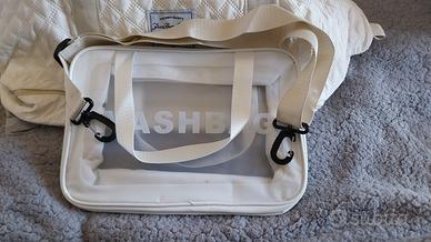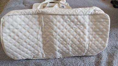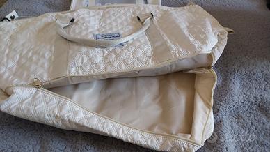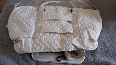 Vendo bellissimo set da viaggio color panna/avorio, nuovo e mai usato, perfetto per weekend fuori porta, palestra o come bagaglio a mano. Il set è composto da una capiente borsa multifunzione e un beauty case coordinato. Caratteristiche principali: Borsa Weekend: Realizzata in tessuto sintetico con elegante trama trapuntata a rombi. È dotata di: Scomparto inferiore separato: Ideale per scarpe o biancheria sporca, accessibile tramite zip dedicata. Tasche intelligenti: Tasca esterna frontale e tasca posteriore "passante" per infilare la borsa comodamente sul manico del trolley. Dimensioni: Larghezza circa 55 cm, altezza circa 32 cm (esclusi manici). Molto capiente ma leggera. Dettagli: Doppi manici resistenti e tracolla regolabile/removibile inclusa. Beauty Case "Washbag": In materiale semi-trasparente e impermeabile, perfetto per i liquidi in aeroporto. Dimensioni capienti, coordinato al colore della borsa. Condizioni: L'articolo è Nuovo senza cartellino. Non presenta segni di usura, macchie o difetti alle cerniere (come visibile in foto). Interni perfettamente puliti e foderati.