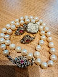 Il set è originale d’epoca (anni ’60–’70), realizzato in argento lavorato con perle vere coltivate e pietre rosse sfaccettate.