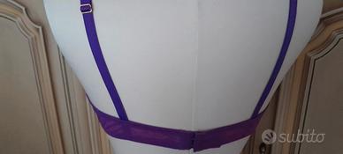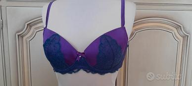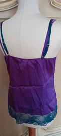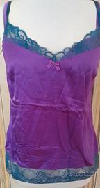 Top e reggiseno taglia L, in seta color ciclamino. Il reggiseno è una 4^ con coppe preformate, spalline regolabili come il top. Tutto guarnito con pizzo blu. Leggermente elasticizzato. Nuovo, mai usato.
