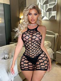Un mini abito audace e seducente in rete nera, perfetto per chi cerca un capo dall’effetto “vedo non vedo”. Il design aderente e le ampie maglie a nido d’ape valorizzano la silhouette, rendendolo un capo ideale per serate speciali o per un look provocante .