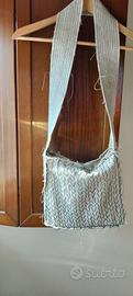 Tracolla artigianale, spesso definita come borsa in stile boho o etnico. Il design è caratterizzato da un'estetica grezza e naturale, con l'uso di tessuti lavorati a mano.