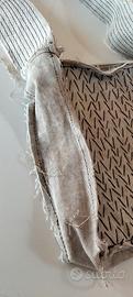 Materiale e Tecnica:La borsa presenta una lavorazione a punto croce con ricami spessi che creano un motivo geometrico a "V". I bordi sono volutamente lasciati sfilacciati, conferendole un aspetto rustico e unico.