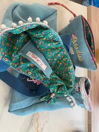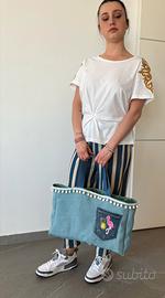 Birsa shopper fatta a mano in canvas color carta da zucchero foderata in cotone satin floreale , con pochette mamma e figlia abbinate