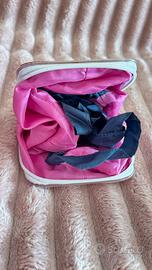 Pratica shopper richiudibile di un vivace color rosa. Esternamente si presenta come un portafoglio plastificato con cerniera e all’apertura si trasforma in una capiente borsa in nylon rosa fucsia con i manici neri