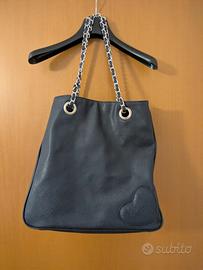 Borsa shopping Camomilla in ecopelle blu, bottoni e taschino interno con cerniera, manici con catenine argento. In perfette condizioni, nuova mai usata. Manca solo la confezione originale