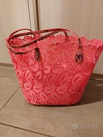 Shopping bag in pizzo e sacchetto interno in tono impreziosita da ciondolo personalizzato cafènoir. Materiale: tessuto