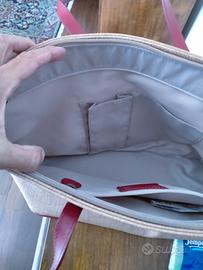 bellissima borsa in tessuto groffato (cotone e poliuretano) con dettagli in pelle rossa,