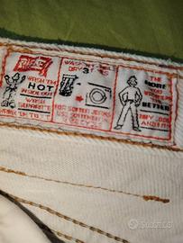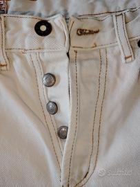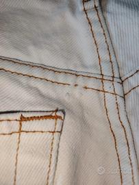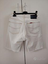 Pantaloncini corti, bermuda. Marca Rifle, in puro cotone. Modello 5 tasche, patta con bottoni, sfrangiati sul fondo. Azzurro chiarissimo quasi bianco. Unisex, misura vita, steso su un piano senza tirare circa 37 cm. Taglia S indicativa. Usati poco, sul retro presentano un graffio come visibile nell'ultima foto.