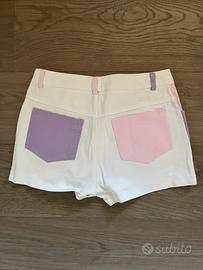Shorts Shein taglia XS, in denim elasticizzato con design a blocchi di colore: bianco, lilla, rosa e giallo. Vita regolare con chiusura a bottone e zip. Comodi e alla moda, perfetti per la primavera e l’estate. In ottime condizioni, indossati una sola volta.