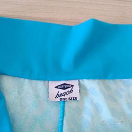 Taglia unica, super elasticizzati, colore azzurro, nodo laterale, asciugano rapidamente, tessuto come quello di un costume.