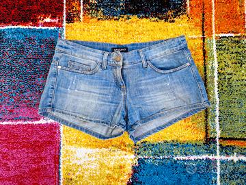 Bellissimi shorts in denim by Mangano Colore azzurro denim con applicazioni dorate sul retro Tg.29 Composizione: cotone, elastan