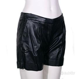 Short in ecopelle di Ermanno Scervino Tg.40. Colore nero. Il modello presenta una cintura in vita e chiude gli short con un gancetto e un bottone interno. E' presente anche una cerniera. Con due tasche laterali e il risvolto alla fine del pantaloncino. In alcune zone del pantaloncino il materiale di ecopelle è venuto via lasciando il tessuto sottostante. Questo compare su un fianco dietro e sulle cuciture. Made in Italy. Si possono ancora indossare con una t-shirt o golfino che scende sui fianchi.