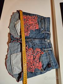 Shorts in denim con inserti in pizzo rosa.