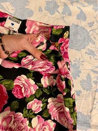 Eleganti e alla moda pantaloncini in denim di Moschino. Neri con fiori rosa. Allacciatura con bottone e cerniera laterale. Taglia 40. Nuovi mai usati.