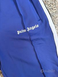 Vendo pantaloncini Palm Angels, colore viola con bande laterali bianche e logo ricamato frontale.