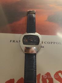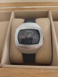 Raro orologio meccanico Sicura originale con complicazione "Jump Hour" (ore saltanti). Design Space Age con cassa cromata di grandi dimensioni e finitura spazzolata. Quadrante con indicazione separata di ore (H), minuti e data (D). Movimento a carica manuale 17 Jewels