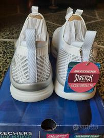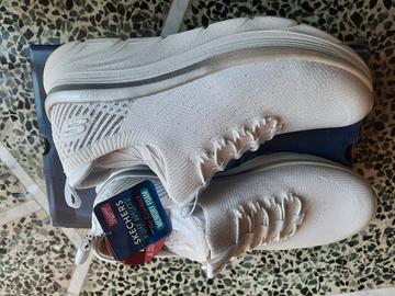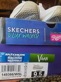 Scarpe Skechers modello D'Lux Walker, facili da indossare, basta infilare il piede, i lacci sono per bellezza. Nuove con cartellino, mai indossate. Colore bianco con piccoli dettagli argentati molto delicati. Leggerissime e comode. - Design slip-in. - Toma in tessuto traspirante. - Suola con tecnologia Air-Cooled Memory Foam.
