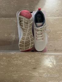 Scarpe running donna indossate una volta, colore bianco con righini rosa. Comodissime