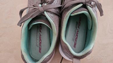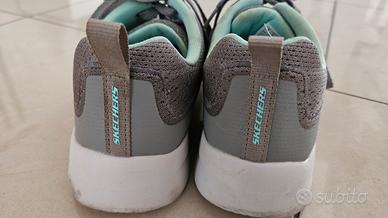 Vendo bellissime sneakers Skechers Dynamight 2.0, modello "Hip Star", in una versatile colorazione grigio melange con freschi dettagli color menta/acquamarina. Dettagli principali: Taglia: 38 EU. Comfort: Dotate di soletta in Memory Foam ammortizzata per una camminata leggerissima. Materiale: Tomaia in mesh tecnico traspirante, perfetto per lo sport o per l'uso quotidiano. Stile: Modello sportivo dal design pulito, con lacci piatti abbinati e suola flessibile bianca. Plus: Leggere, flessibili e, come molti modelli Skechers, lavabili in lavatrice. Ottime condizioni, indossate pochissime volte.