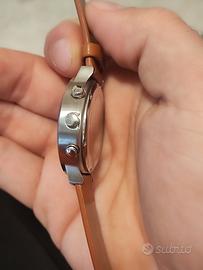 Quadrante da 38mm, batteria nuova appena sostituita, cinturino in pelle marroncino nuovo e in aggiunta un altro sempre nuovo in pelle di colore nero.
