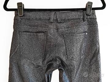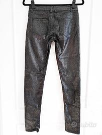 Pantaloni da donna leggeri e aderenti quasi come jeggings leggings, nero argentato metallizzato. Modello skinny jeans a VITA BASSA. Vintage. Cotone, poliestere e elasten. Senza etichette, taglia M / L. Marca Fionina. Primavera / estate. Particolare tessuto nero glitterato con brillantini argento. I glitter sono cuciti nella stoffa e ne risulta un tessuto morbido al tatto. Ottimi per il lavoro, feste, eventi. Misure dei jeans piatti in cm Vita BASSA 36-45 Fianchi 43-53 Lunghezza interno gamba 78 Larghezza fondo gamba 13-18 Cavallo davanti 19 Cavallo dietro 31 Condizioni: semi-nuovi. Indossati massimo 1 volta per pochissimo tempo.