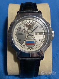 Slava Automatico acquistato nuovo ad inizi anni 90 in Bosnia Erzegovina. Orologio russo autentico al 100%!Pezzo acquistato solo ed esclusivamente a scopo collezionistico, indossato in totale una decina di volte poi riposto in cassetta con sali di silicio . Quindi condizioni eccezionali. Messo in movimento una volta al mese. Movimento automatico Slava 2427 day date. Rimessa data rapida.Mai aperto ne revisionato / funziona benissimo e come tutti gli orologi russi prende qualche secondo al giorno. Lo propongo in un momento dove gli acquisti tramite i soliti canali dalla Russia sono praticamente impossibili, salvo passare per resellers polacchi o tedeschi ( coi relativi rincari). E rischiare acquisti di secondi polsi malmessi. Questo Slava non ha MAI preso una goccia di acqua anzi, raramente uscito di casa!Vendita tra privati con formula visto e piaciuto, senza garanzia alcuna.