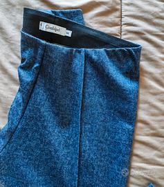 Si tratta di un modello slim fit o a sigaretta con una tonalità blu denim scuro, che ricorda la texture del jeans ma con la morbidezza tipica di un tessuto elasticizzato. Presenta una fascia in vita elasticizzata, senza chiusure lampo o bottoni visibili sul davanti, puntando tutto sul comfort.