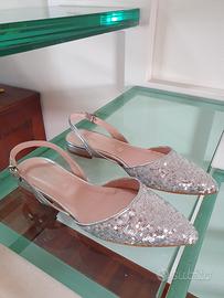 scarpe aperte sul tallone con cinturino w punta sfilata, interamente coperte di paillettes argentate- made in italy.