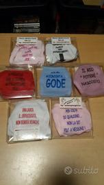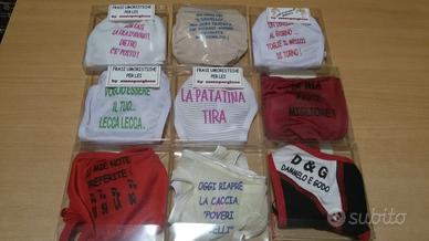 Vendo slip perizioma frasi umoristiche, taglia unica. Colori e modelli vari, come da foto. Nel caso di acquisto specificare il modello che volete. Possibilità di spedizione o consegna a mano. Per acquisti dai 5 pezzi in poi sconto da concordare. Per ulteriori info contattatemi.