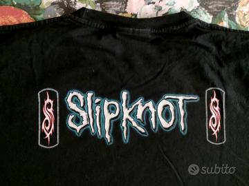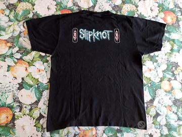 Slipknot Mick Thomson Guitarist (vintage) L T-shirt Slipknot Mick Thomson (double print) Taglia L , colore nero marca Rock Chang Cotone di resistente di ottima qualita' Larghezza spalle 47cm Larghezza torace 54cm lunghezza 68cm Ha quasi 20 anni, eccellenti condizioni -Stampa gommata front: Slipknot Mick Thomson -Stampa gommata rear: Slipknot logo