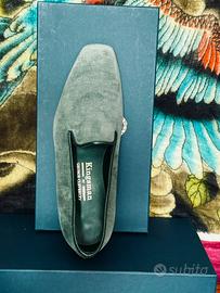 Slippers KINGSMAN in sage green velvet, verde salvia, by George Cleverly fatte a mano. In taglia 6Uk, misura 40, splendido e intramontabile mocassino della nota maison di moda maschile londinese. Un classico intramontabile e raffinato dell'abbigliamento maschile. Nuove, mai indossate. Calzatura elegante e raffinata, da indossare a cene di grand gala sotto uno smoking moderno o, tutti i giorni, da sdrammatizzare con jeans e camicia. Adatte a un piede magro, perché come tutte le scarpe di manifattura inglese sono assai strutturate per mantenere inalterata la forma negli anni. Per veri intenditori e appassionati della ricercatezza, le vendo a prezzo da vero affare! Scatola originale.