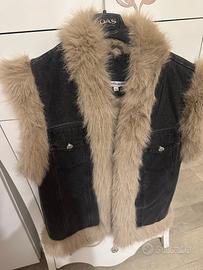 Smanicato in jeans nero con eco pelliccia beige taglia unica