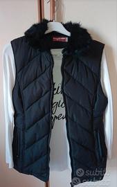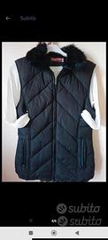 Smanicato nero imbottito con vera piuma lavabile in acqua. Al collo bordo in vera pelliccia. Taglio avvitato. Due taschine altezza seno e due in basso.