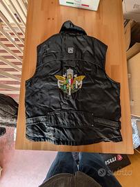 Smanicato da moto Piero Guidi, scelto dalla FMI, buone condizioni, nessuno strappo o scucitura, taglia XL, in nylon leggermente imbottito, personalizzato sulla schiena con stemma ricamato dell' FMI, esemplare raro dato in dotazione ai commissari di gara della Federazione, disponibile stemma aggiuntivo dei commissari, chiusura a zip più automatici, 4 tasche frontali, prezzo poco trattabile.