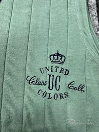 Bellissimo smanicato vintage originale United Colors of Benetton anni 90 in delicato verde pastello con profili blu a contrasto sullo scollo a V. Modello in maglia a costine verticali, vestibilità morbida e comoda, perfetto per look preppy e college style. Logo ricamato sul petto “United Colors Class Coll” che richiama l’estetica iconica del brand. Ideale da indossare sopra camicia bianca o t-shirt per un outfit retrò autentico. In ottime condizioni vintage.
