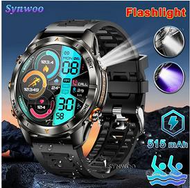 Smartwatch Synwoo Ultra 3.71cm con schermo touch completo - IPX8, torcia LED e lampada UV, chiamata wireless, grande batteria da 515mAh, tracker fitness all'aperto con modalità sportive, previsioni del tempo, per uomini/donne, orologi sportivi | Bracciale in silicone