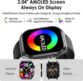 𝐀𝐌𝐎𝐋𝐄𝐃[Nuovo smartwatch migliorato con schermo AMOLED da 2,04 pollici] Il nostro nuovo smartwatch è dotato di uno schermo AMOLED da 2,04 pollici migliorato, che offre una qualità dell'immagine più chiara e colori più vivaci. Puoi goderti il massimo effetto visivo sia al sole che di notte. La tecnologia AMOLED garantisce un contrasto più elevato e neri più profondi, risparmiando energia e prolungando la durata della batteria, l'immagine è vivida e chiaramente visibile e ha una protezione aggiuntiva dello schermo.