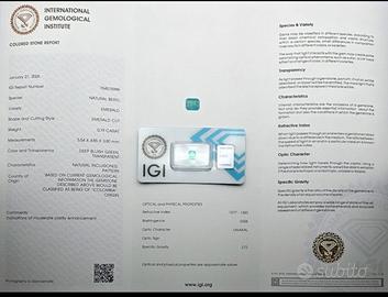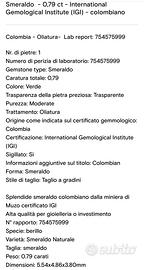 vendo stupendo smeraldo colombiano di 0,79 carati, ideale da incastonare in un anello o in un collier, o come pietra da investimento, colore strepitoso, corredato di certificato riconosciuto IGI
