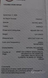 Smeraldo naturale certificato IGI (International Gemological Institute) Peso: 1.24 carati Taglio: square step cut (taglio smeraldo) Dimensioni: 6.03 x 5.47 x 4.67 mm Colore: verde naturale Trasparenza: trasparente Origine: Zambia Inclusioni: naturali (tipiche degli smeraldi) Trattamenti: minor clarity enhancement (leggera oliatura) standard nel settore Certificato IGI incluso. Prezzo leggermente trattabile. Consegna a mano o spedizione assicurata Visione disponibile Pagamento sicuro