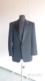 Smoking uomo di alta sartoria e pellicceria firmato Pagano, storica boutique di Bergamo, simbolo di eleganza senza tempo. Tessuto in pregiata miscela 50% lana e 50% seta, nero, morbido al tatto e raffinato in ogni dettaglio, in taglia 48