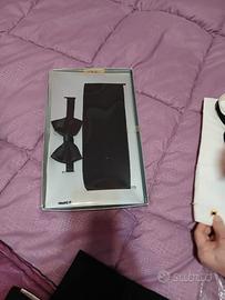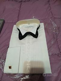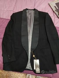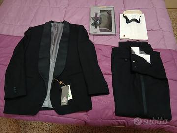Smoking nero in pura lana vergine taglia 48, nuovo, mai indossato ancora con i cartellini originari, marca Adolfo Trabaldo; completo di camicia marca Nazareno Gabrielli cotone/lino taglia 40 collo 15 e 3/4, fascia e papillon in seta neri.