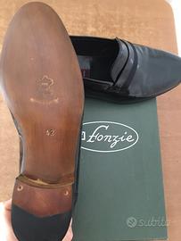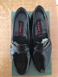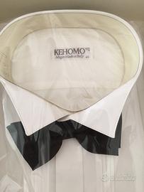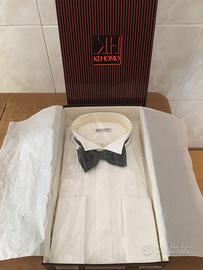 Smoking completo: guacca con pantaloni taglia 48, nero, pura lana vergine; camicia taglia 15 3/4 -40; scarpe pelle nera, taglia 42. Tutto Made in Italy. Nuovo.