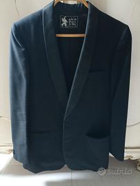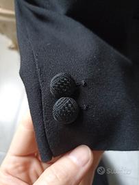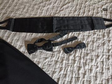 Vendo smoking nero in ottime condizioni della fine degli anni '60, con collo a scialle in raso, completo di pantaloni con riga laterale sempre in raso, fascia vita e due tipi di papillon anch' essi in raso, bottoni lavorati sempre in raso. Taglia 46. Larghezza spalle giacca 42 cm., lunghezza maniche 63 cm., circonferenza vita pantaloni 85 cm., lunghezza cavallo pantaloni 36,5 cm., lunghezza gamba 102 cm..