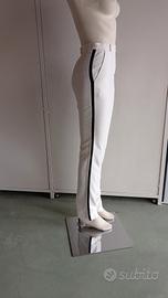 Il Pantalone: Taglio fluido e sartoriale, caratterizzato dalla banda laterale nera che slancia la figura, richiamando la tradizione del tuxedo maschile in chiave femminile.